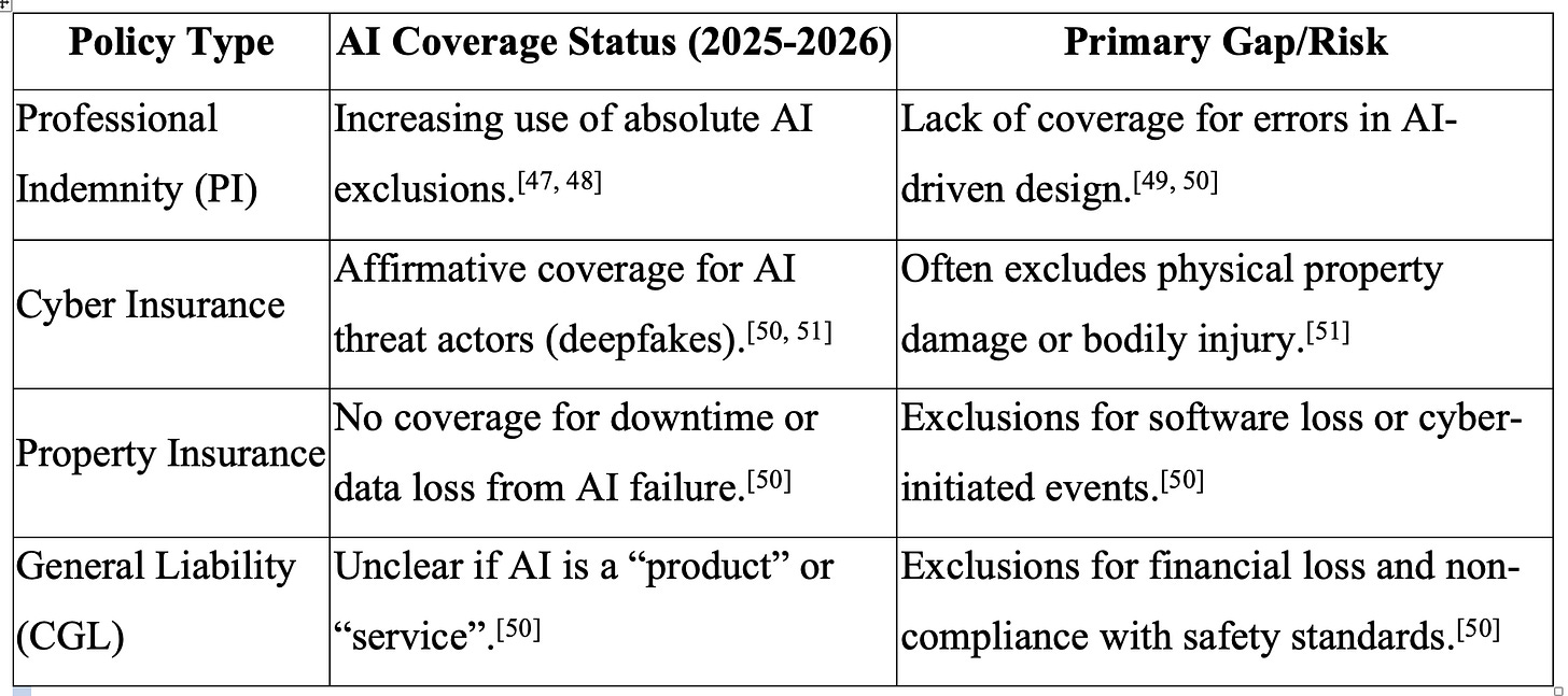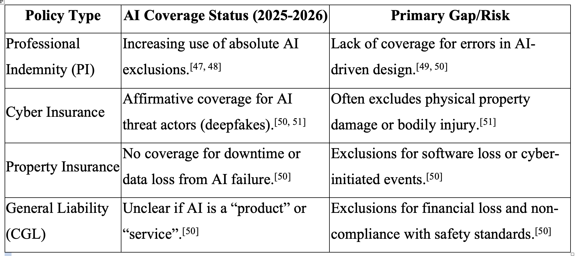 “Silent AI” refers to risks that are neither explicitly included nor excluded in a policy, creating massive ambiguity and potential coverage gaps.[49] For construction firms, this means a structural failure caused by a 3D printer malfunction might be denied under a standard PI policy because it involved an “autonomous system,” but also denied under a property policy due to cyber-related exclusions.[49, 50] The market is currently seeing a small handful of AI-specific products, such as those from Armilla AI, but these rarely cover “bodily injury or property damage,” leaving the most critical construction risks unaddressed.[51]